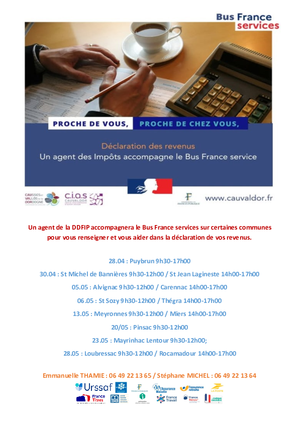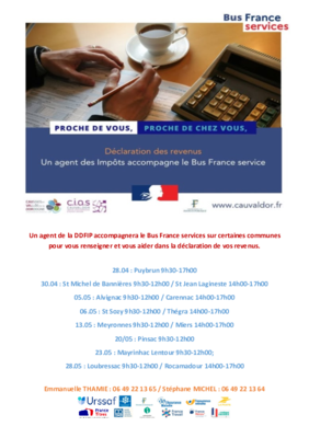 La campagne déclarative de l’impôt sur le revenu a commencé, un agent des impôts sera présent lors des permanences du BUS France services et Cias sur les créneaux suivants :