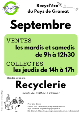 Nouveau calendrier des collectes et des ventes de l’association Recycl’éco du pays de Gramat pour le mois de Septembre.